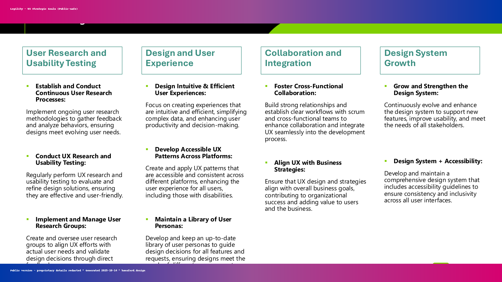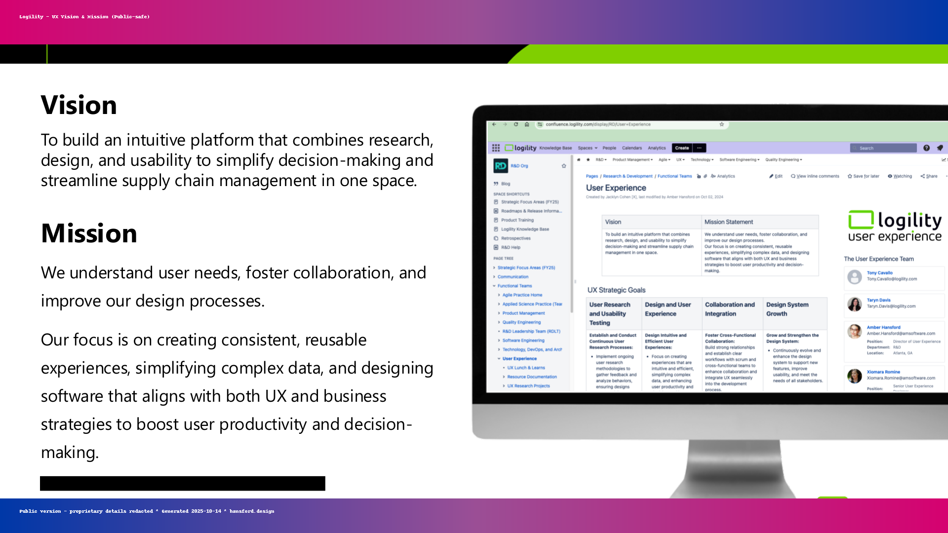 Snapshot used to align Product, Engineering, and execs on UX’s purpose and scope. Names/URLs redacted.